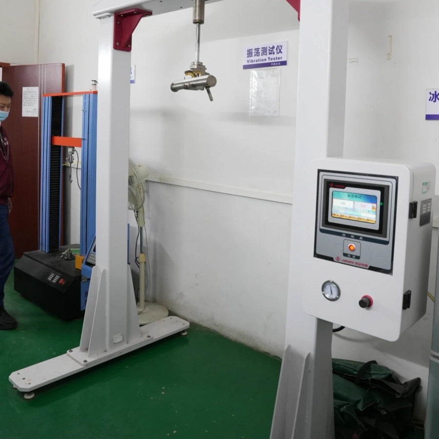 The vibration test simulates transportation conditions to evaluate the durability of bags and packaging. Products are subjected to controlled vibration to ensure structural integrity, secure stitching, and stable hardware during shipping and handling.